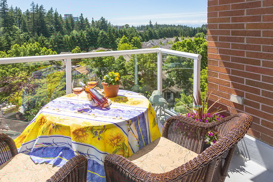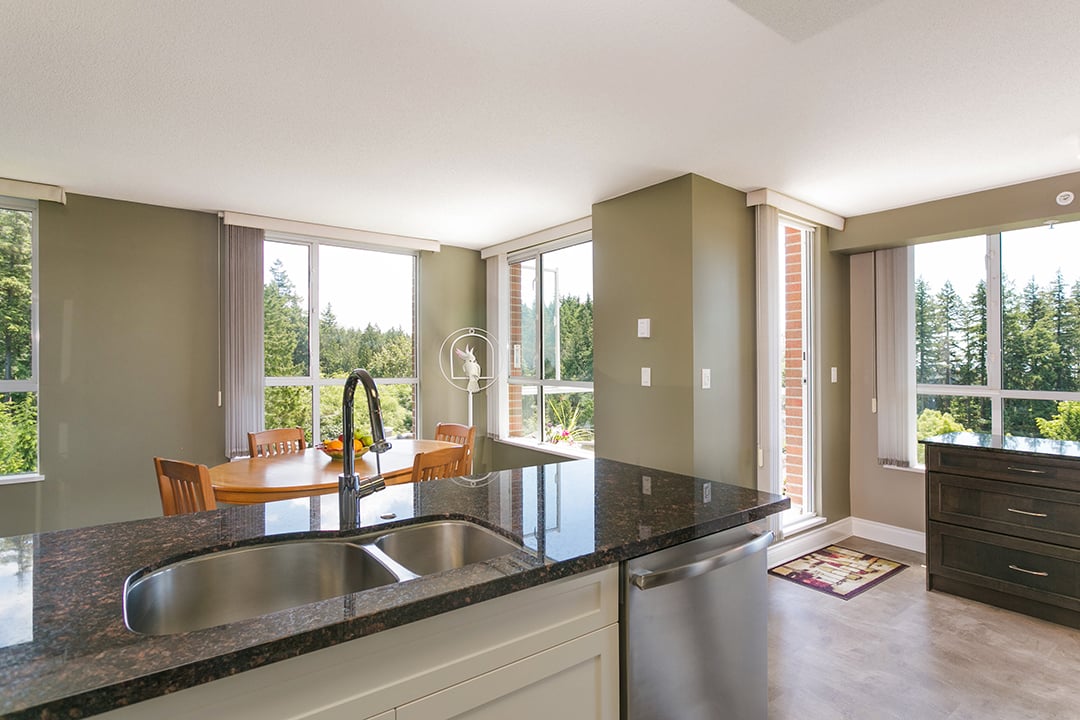 A spacious 1394 sq. ft rancher in the sky with tons of natural light. Unobstructed picture windows provide wrap around sunrise and sunset views stretching across UBC endowment lands to the Georgia Strait. The layout flows for entertaining and allows for house-sized furnishings. Features Brazilian Cherry hardwood flooring, new appliances, freshly painted throughout, and has a bright updated airy kitchen which encompasses an open family room, an eat-in area, and a tranquil balcony retreat. New custom "phantom" screening on windows. Enjoy the Balmoral amenities with 2 s/s parking, large storage locker, indoor pool, spa, sauna, gym, billiard & party room. Close to Pacific Spirit Park trails, shopping, schools, and all that UBC campus offers.